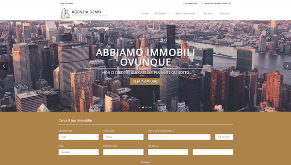 Sito responsive con slider immobili in evidenza in home page a piena larghezza e box con foto delle shortcut.